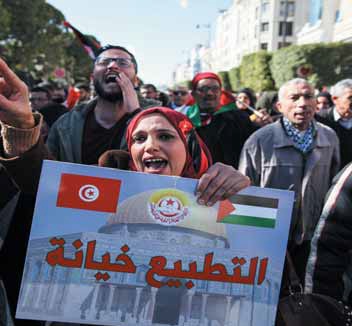 كما طالب نشطاء تونسيون، سلطات بلادهم، بتخصيص “يوم وطني لمناهضة الصهيونية”، في إشارة إلى الاحتلال الإسرائيلي بفلسطين، و=جاء ذلك خلال وقفة احتجاجية، نظمها عشرات التونسيين قبل عدة أيام، في شارع الحبيب بورقيبة، وسط العاصمة تونس، للتنديد بتطبيع العلاقات بين البحرين والإمارات مع الكيان الصهيوني. ورفع المشاركون في الوقفة، العلم الفلسطيني، كما رددوا شعارات عديدة، بينها: “مقاومة مقاومة.. لا صلح لا مساومة”، الشعب يريد تجريم التطبيع”، “السيادة الوطنية هي جوهر القضية”.