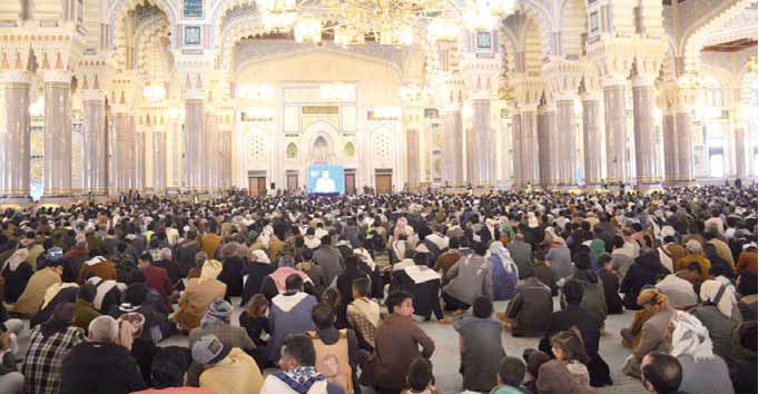 وفي كلمته التي ألقاها أمس الاثنين عن طريق الفيديو في اللقاء الموسع بجامع الشعب بحضور جمع كبير من المواطنين والمسؤولين وقيادات الدولة، وصف قائد الثورة إحياء مناسبة المولد النبوي الشريف بأنها تعبير عن الشكر لله على النعمة التي منّ بها على البشرية ، واعتبر الحضور الكبير من الجانب الرسمي والشعبي مظهرا يعكس الانسجام الشعبي والرسمي، والتوجه الموحد الذي يشمل الجميع في إطار العمل لما فيه رضا الله «سبحانه وتعالى»، والاهتمام بالمناسبات الدينية المباركة الجامعة.