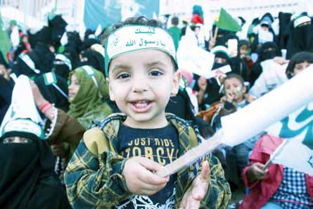 الاحتفالات التي إقامها اليمنيون في ذكرى المولد النبوي الشريف تشكل لوحة الوفاء لرسول الله رسول الهدى والسلام في مشهد جمالي وروحاني مليء بالكثير من المظاهر الاحتفالية المعبرة عن حب الرسول الأعظم وخصوصية هذه المناسبة العظيمة ومكانتها الكبيرة في قلوب الشعب اليمني والمرأة اليمنية كانت في هذه المناسبة العظيمة كعادتها في مقدمة الصفوف مدركة لدورها المهم في تعزيز روح الولاء الوطني وترسيخ قيم التكافل الاجتماعي بالاحتفاء بمولد خير البشرية، لتثبت حبها لرسول الله، وارتباطها به.