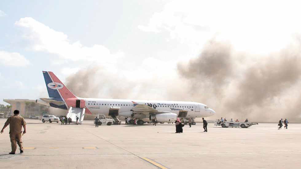 انفجارات واشتباكات وهلع وارتباك أمني، تسيد مشهد وصول وزراء حكومة الارتزاق التي شُكلت في الرياض وأدت اليمين الدستورية في إحدى فنادقها ، وزامنت الانفجارات مع وصول الطائرة التي تقل العائدين من الرياض.