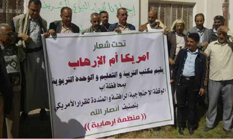 وفي إب نظم مكتب التربية والتعليم بالمحافظة أمس وقفة تنديداً بالقرار الأمريكي تصنيف أنصار الله منظمة إرهابية.