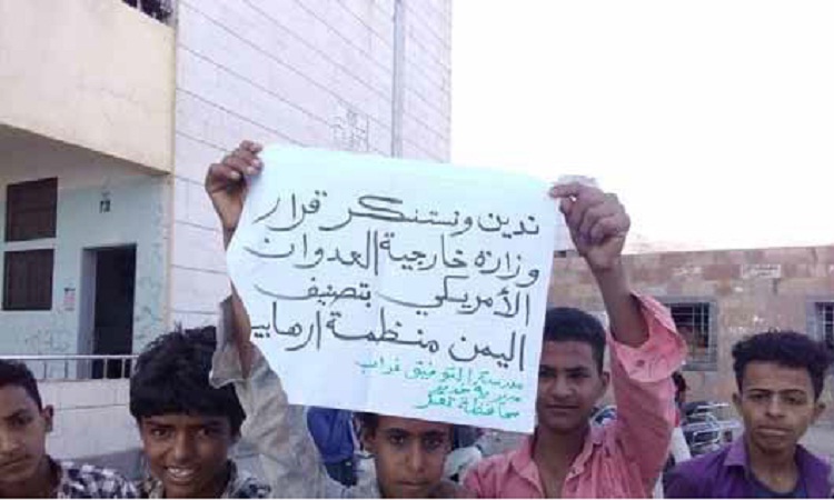 من جهته نظم مكتب التربية والتعليم بمحافظة الحديدة أمس وقفة ومسيرة احتجاجيتين للتنديد بقرار الإدارة الأمريكية تصنيف أنصار الله منظمة إرهابية.