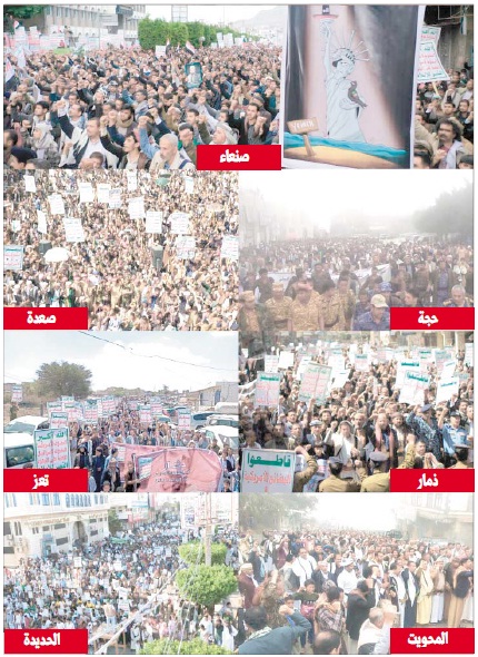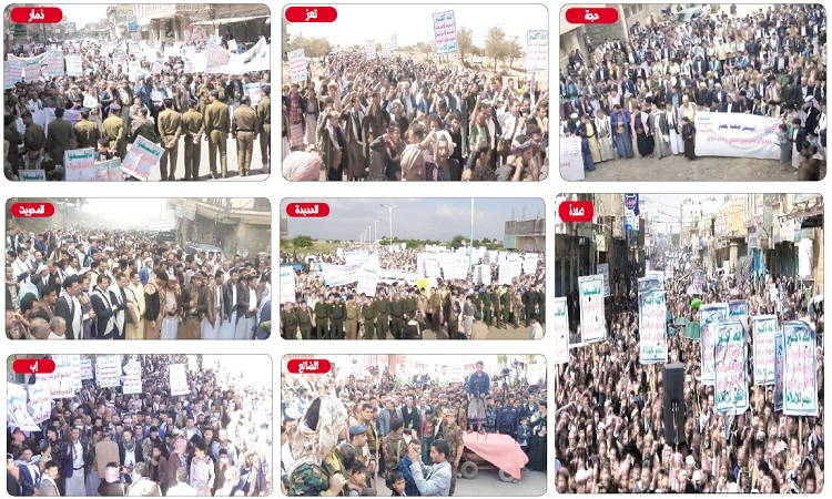 مظاهرات جماهيرية كبرى في 19 ساحة بالعاصمة صنعاء والمحافظات تنديداً بالحصار الأمريكي على اليمن