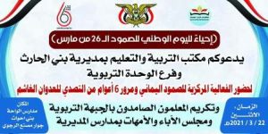 ينظم مكتب التربية والتعليم بمديرية بني الحارث وفرع الوحدة التربوية، فعالية احياء اليوم الوطني للصمود، من خلال اقامة الفعالية المركزية للصمود اليماني يوم غد الاثنين بمدارس الواحة التعليمية .