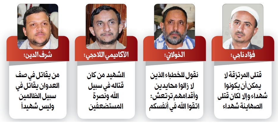 يقول الأخ / فؤاد ناجي – نائب وزير الأوقاف والإرشاد: الشهادة مصطلح قرآني أطلقها الله سبحانه وتعالى لمن يسقط في جبهة الحق ضد الباطل .. وبالتالي نحن ندافع عن أنفسنا دفاعاً مشروعاً ومحقاً ضد الباطل الذي يحظى بدعم أمريكا وإسرائيل فقتلى المرتزقة لايمكن أن يكونوا شهداء وإلا كان قتلى الصهاينة شهداء .