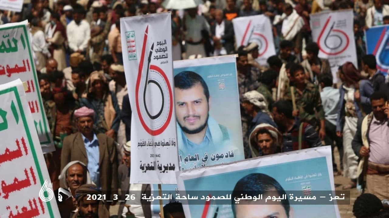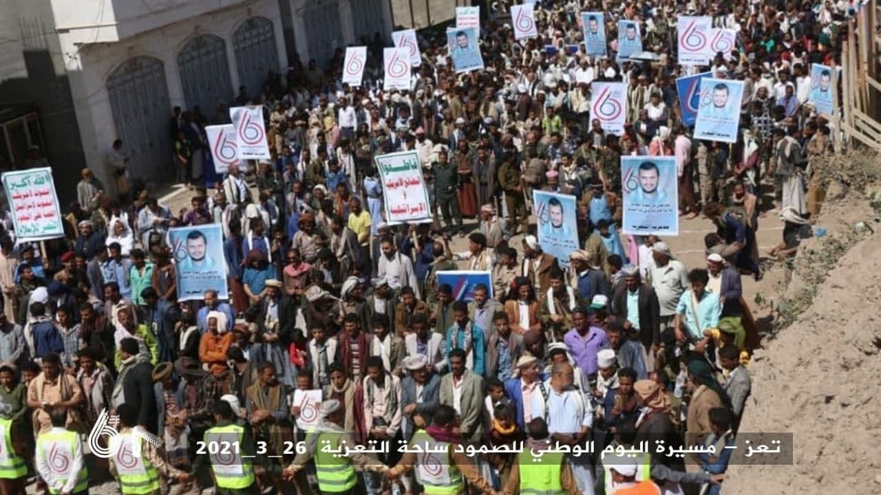 احتشد أبناء محافظة تعز في ساحات مفرق ماوية بمديرية التعزية ودمنة خدير بمديرية خدير، والكمب بمديرية مقبنة، لإحياء ذكرى مرور ستة أعوام من الصمود في وجه العدوان ” يوم الصمود الوطني”.