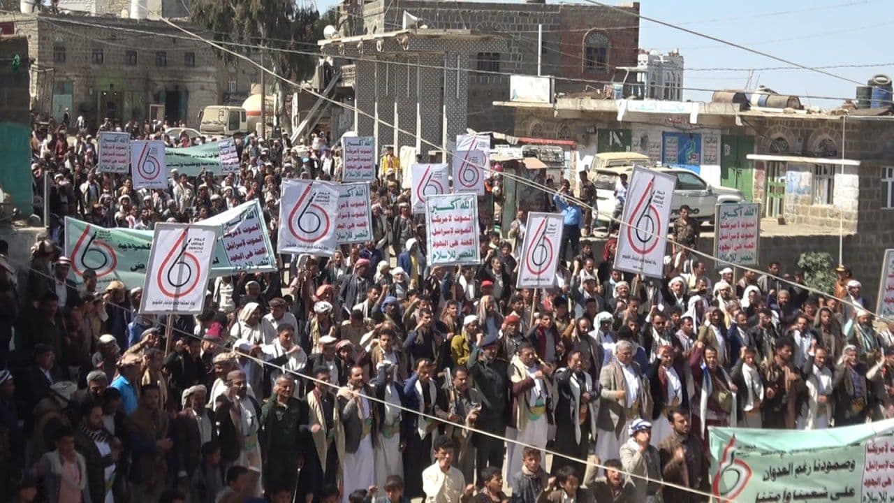 ورفع المشاركون في المسيرة اللافتات ورددوا الشعارات المستنكرة استمرار العدوان الأمريكي السعودي والحصار على الشعب اليمني منذ ست سنوات.