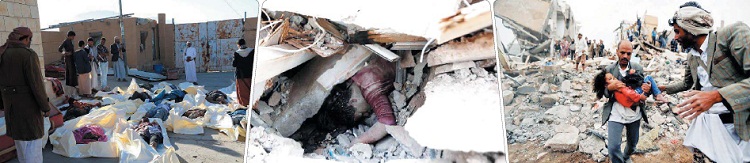 منذ 2015، استهدف تحالف العدوان الذي تشرف عليه أمريكا وتنفذه السعودية والإمارات بـ300 ألف غارة جوية المدنيين والأعيان المدنية فأصابت المنازل والمدارس والمستشفيات والأسواق والمساجد ومواكب الأعراس والجنازات ، وقد وثَّق المركز القانوني «أربعة آلاف» مذبحة ارتكبها التحالف العدواني في المحافظات والقرى والمدن اليمنية ، وقد نتج عنها سقوط حوالي 20 ألف قتيل و30 ألف جريح من المدنيين.