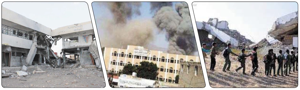 فكان ولا يزال لقطاع التعليم النصيب الأوفر من التدمير والقتل جراء استهدافهم المتعمد للعملية التعليمية بغرض شل وإيقاف حركتها من خلال ضرب وتدمير المبنى المدرسي في جميع المحافظات وإيقاف صرف رواتب المعلمين منذ السنة الأولى للعدوان ومنع استيراد ووصول الأوراق المدرسية لطباعة الكتاب المدرسي ونشر الأوبئة عبر الجو لاستهداف المجتمع بأسره كمحاولة لنشر الذعر والخوف بين أفراد المجتمع بغرض إيقاف العملية التعليمية .