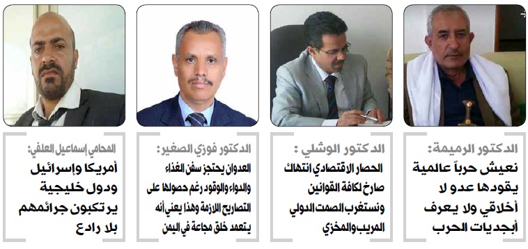 المحامي والحقوقي إسماعيل العلفي هو الآخر تحدث عن هذا الحصار واحتجاز السفن فقال:»لا شك أن الحصار البحري واحتجاز سفن الغذاء والدواء والمشتقات النفطية من قبل عصابات العدوان ومن حالفهم وتآمر معهم على أبناء الشعب اليمني من المنظمات الأممية والمجتمع الدولي ولو نظرنا إلى الأعراف والمواثيق الدولية وقواعدها حول تجريم الحصار بشكل عام سواء كان منعنا من الحصول على الغذاء أو الدواء أو المشتقات النفطية أو ما تلا ذلك من الاحتياجات الضرورية للبقاء على قيد الحياة لوجدنا أن ذلك الحصار يعتبر جريمة من جرائم الحرب في بعض نصوص ومواثيق الأمم المتحدة والجرائم ضد الإنسانية المنصوص عليها في نظام روما الأساسي ومحكمة الجنايات الدولية وذلك في المادتين الخامسة والسادسة من النظام الأساسي للمحكمة، ولو نظرنا إلى أساس تطبيق المادتين على واقعنا اليومي في اليمن لوجدنا أن اليمن ليس طرفا من أطراف المحكمة الجنائية الدولية، وصحيح أنه طرف من أطراف نظام روما الأساسي وصادق على النظام ولكنه لم يصادق على اختصاص المحكمة الجنائية الدولية بـالجرائم التي ترتكب في اليمن وضد اليمن، وعليه فإن اختصاص المحكمة الجنائية ينطبق علينا من الناحية الموضوعية ولا ينطبق علينا من الناحية الشكلية والإجرائية ولو أردنا من المحكمة الجنائية أن تمارس اختصاصها فإن ذلك قد يكون مقبولاً بشرط تقديم المصادقة وعليه سوف تمارس المحكمة الدولية إجراءاتها تجاه أطرافها فقط سواء كان أطرافها متهمون بارتكاب جرائم دولية أو مرتكبة ضدهم جرائم دولية ومن المعروف أن محكمة الجنايات الدولية اشترطت تلك الشروط حفاظا على سيادة الدول التي قد تحتج بانتهاك سيادتها أو بدون موافقتها، والمشكلة أن أمريكا وإسرائيل وبعض الدول الخليجية ليسوا طرفا من أطراف محكمة الجنايات الدولية ما يعني استحالة معاقبتهم قانونا بشأن الجرائم التي ارتكبوها ضد اليمنيين وحصارهم، وعليه فنحن نعول على سواعد الشباب في اليمن أولا وأحرار العالم ثانيا بالثأر لشهدائنا وجرحانا ومعاناتنا وأنا أثق بأن اليمن سوف تنتصر عما قريب.