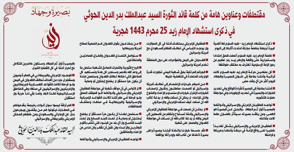 أكد قائد الثورة السيد عبدالملك بدرالدين الحوثي، أن ثورة الإمام زيد بن علي عليهما السلام تعد نهضة مباركة امتدت إلى واقعنا اليوم، وقال في كلمته أمس الخميس 25 محرم – بمناسبة ذكرى استشهاد الإمام زيد عليه السلام – إن «ذكرى استشهاد الإمام زيد عليه السلام لها أهمية كبيرة تربطنا بنهضة مباركة امتدت آثارها إلى اليوم».