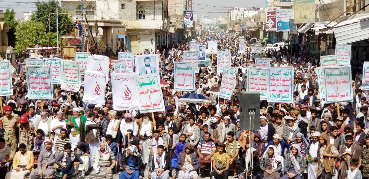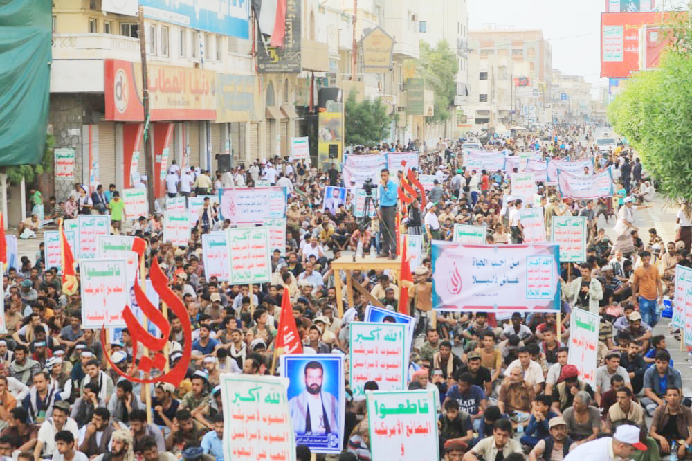 ورفع المشاركون في المسيرة – التي تقدمتها قيادة السلطة المحلية بالمحافظة – شعارات الحرية المناهضة للسياسة الأمريكية المستبدة في المنطقة، ولافتات تدعو لمقاطعة البضائع الأمريكية والإسرائيلية.