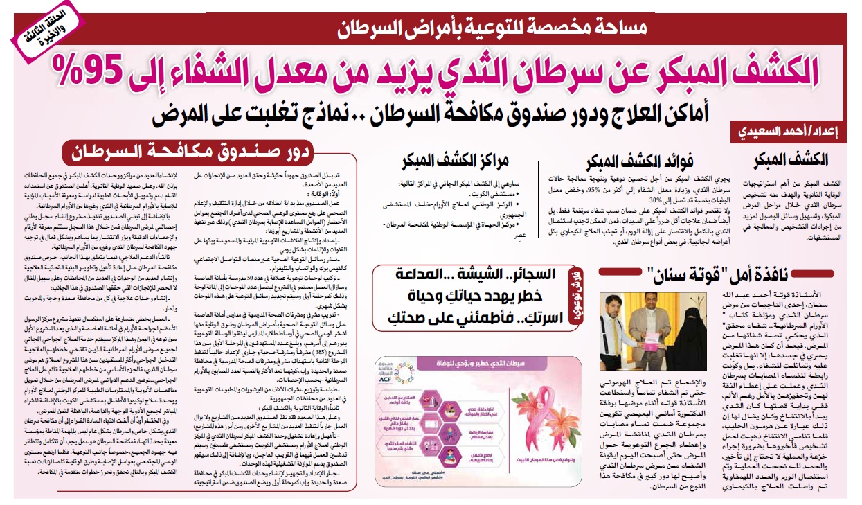 ـ جار الإعداد والتجهيز لإنشاء وحدات للكشف المبكر في محافظة صعدة والحديدة وإب كمرحلة أولى ويضع الصندوق ضمن استراتيجيته لإنشاء العديد من مراكز ووحدات الكشف المبكر في جميع المحافظات بإذن الله. وعلى صعيد الوقاية الثانوية، أعلن الصندوق عن استعداده التام دعم وتمويل الأبحاث الطبية لدراسة ومعرفة الأسباب المؤدية للإصابة بالأورام السرطانية في الثدي وغيرها من الأورام السرطانية.