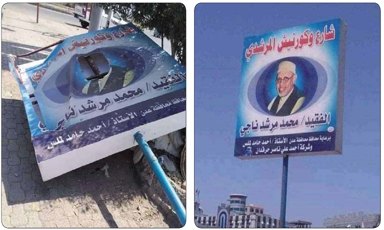 وبعد بضعة أيام اسقطت اللوحة أرضا ومزقت الصورة، والفاعل قيادي كبير في الحزام الأمني الانتقالي ، حسب شهود عيان وأقارب المرشدي .
