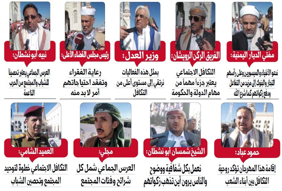 في يوم يماني إيماني بهي ملأته الفرحة والبهجة والسرور تجسدت البسمات العرائسية والفرائحية في وجوه 7200 عريس وعروس جمعهم عرس جماعي كبير على شكل كرنفال شعبي عظيم يعد الأول والأكبر في اليمن والمنطقة برعاية كريمة من قيادة الثورة والقيادة السياسية وبدعم من هيئة الزكاة طبقاً لمصارف الزكاة الشرعية بحضور رسمي وجماهيري كبير، أكد على أن هذه الخطوة تمثل نموذجاً إسلامياً اجتماعياً تكافلياً يجب الاقتداء به على مستوى الأمة وهي خطوة يمانية تؤكد المضيء في ممارسة الحياة الطبيعية وتجاوز كل الصعاب التي فرضها العدوان والحصار وهي تحدٍ كبير ورسالة مقابل التصعيد الذي تنفذه قوى العدوان الأمريكي السعودي الصهيوني على اليمن خلال هذه الأيام.