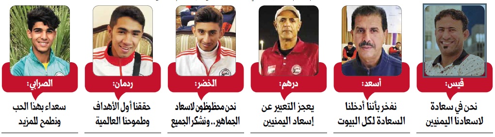 وقال مساعد المدرب فيصل أسعد، نشعر بسعادة كبيرة نظير ما حققناه وما أسهمنا به في إسعاد الشعب اليمني، الذي يعاني منذ سنوات، وأضاف: نفتخر باننا أدخلنا السعادة إلى البيوت اليمنية، ونهدي هذا اللقب لعامة الشعب، ونسأل الله أن تكون هذه بداية الأفراح لليمن واليمنيين.
