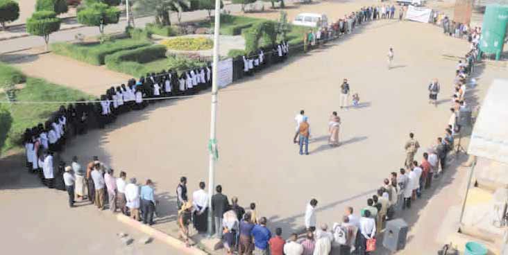 كما نظم أطباء وموظفو مجمع الساحل الغربي الطبي التعليمي بمحافظة الحديدة، أمس وقفة احتجاجية تنديدا بتصعيد العدوان الأخير واستهداف المؤسسات الخدمية المدنية والقرصنة سفن المشتقات النفطية.