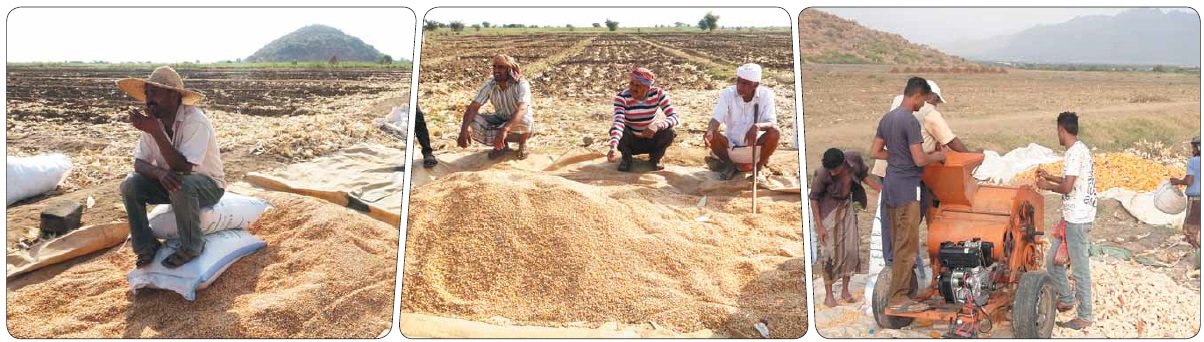 أكد المزارع حسين التزامه بتعليمات الجمعية والشاهد في فائدتها أن الالتزام بها أعطى نتائج جيدة.. الجمعية أعطته كيسين من بذور الذرة الشامية عبوة 40 كجم، بالإضافة إلى دبتين ديزل أعطاها لحراثة وحدة الحراثة مضافا عليها 7500 ريال/ساعة، واستعان بالمنظومة الشمسية في عمليات الري.. لم يقم بأي تدخلات لم تنصح بها الجمعية عدى استخدم القليل من الذبل البلدي في بعض الأماكن.. ظهرت لديه الدودة والجرمي، وتم القضاء عليها بالرش في الوقت المناسب وعبر الاستعانة بمعدات وفرتها الجمعية في مبادرة طيبة ومستعجلة.