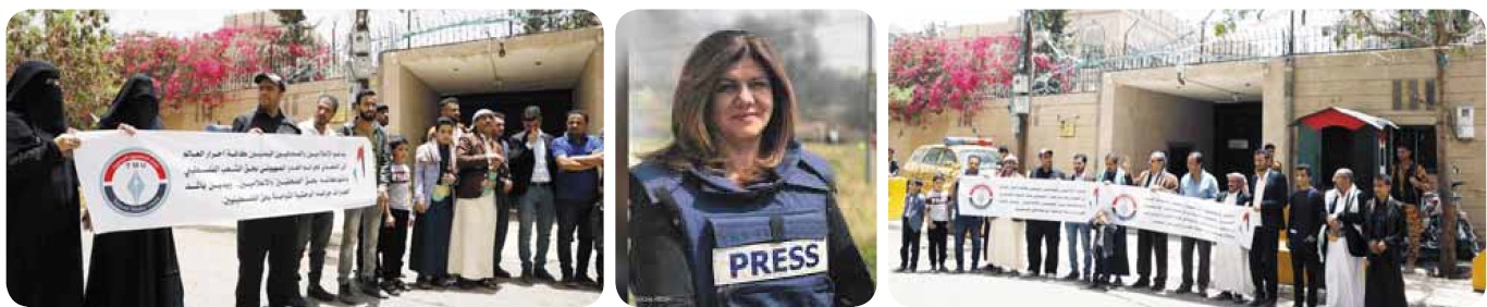 نظم اتحاد الإعلاميين اليمنيين أمس في صنعاء وقفة احتجاجية تنديداً باغتيال العدو الصهيوني لمراسلة قناة الجزيرة الصحافية الفلسطينية شيرين أبو عاقلة وإصابة مراسل صحيفة القدس الزميل علي سمودي.