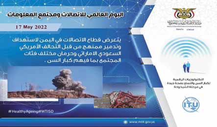 وتحرص وزارة الاتصالات وتقنية المعلومات، على الاحتفاء كل عام باليوم العالمي للاتصالات، إيماناً منها بأهمية مواكبة التحول الرقمي، وسعياً لتكون حاضرة في هذا المسار، ومن أجله تكرر الدعوات والمناشدات للاتحاد الدولي للاتصالات والمنظمات الدولية ، في ذكرى تأسيسه كل عام، للوقوف بجدية أمام استمرار توسع الأضرار والتداعيات المأساوية التي تخلفها الحرب الممنهجة لشبكة الاتصالات والبنية التحتية لها ، لكن المناشدات لم تحظَ حتى اللحظة بأي استجابة أو التفاتة.