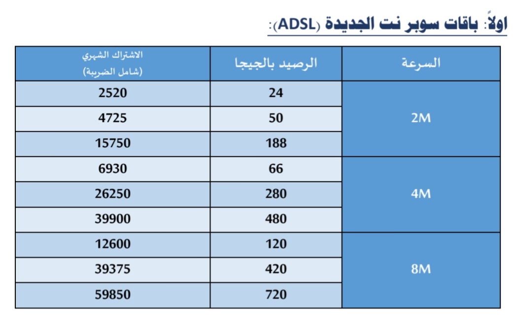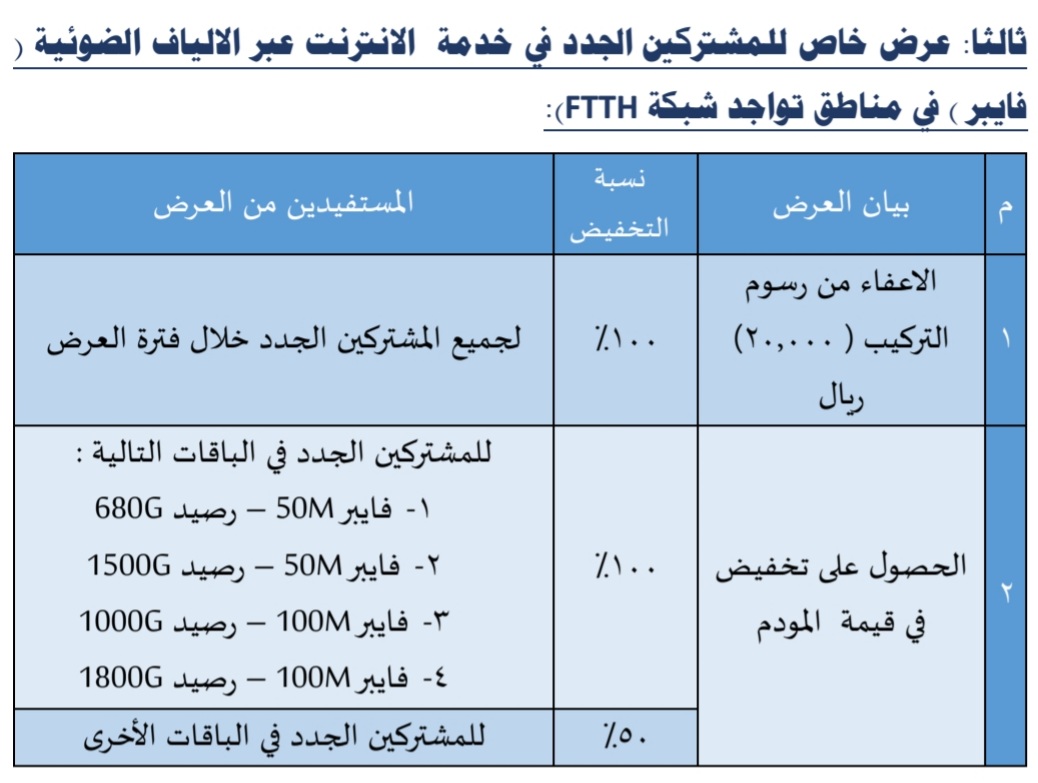 وأشار إلى أن المؤسسة تقدم تخفيضات وعروض باقات جديدة بأحجام متعددة وأسعار مناسبة لخدمات الانترنت الثابت عريض النطاق (ADSL-FTTH) تشمل تخفيض في سعر الجيجا وزيادة في الأرصدة، وإنزال عرض مصاحب يشمل إعفاء الأفراد من رسوم إدخال خدمة الإنترنت عبر الألياف الضوئية (FTTH) ومنحهم تخفيضات في أسعار المودمات للمشتركين الجدد.