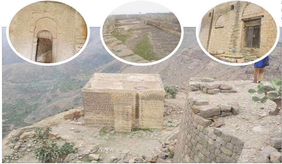 والى الشمال منها هاوية تفصل قمة الجبل الذي شيد عليه حصن “تاج العروس” ومبانيه شاهدنا ما تبقى من آثار البناء التي كانت بأعلاه فاستغربنا في دهشة عن الطريقة التي وصلت بها الأحجار إلى تلك القمة الشاهقة قبل أن نسأل عن العبقري الذي بناها.