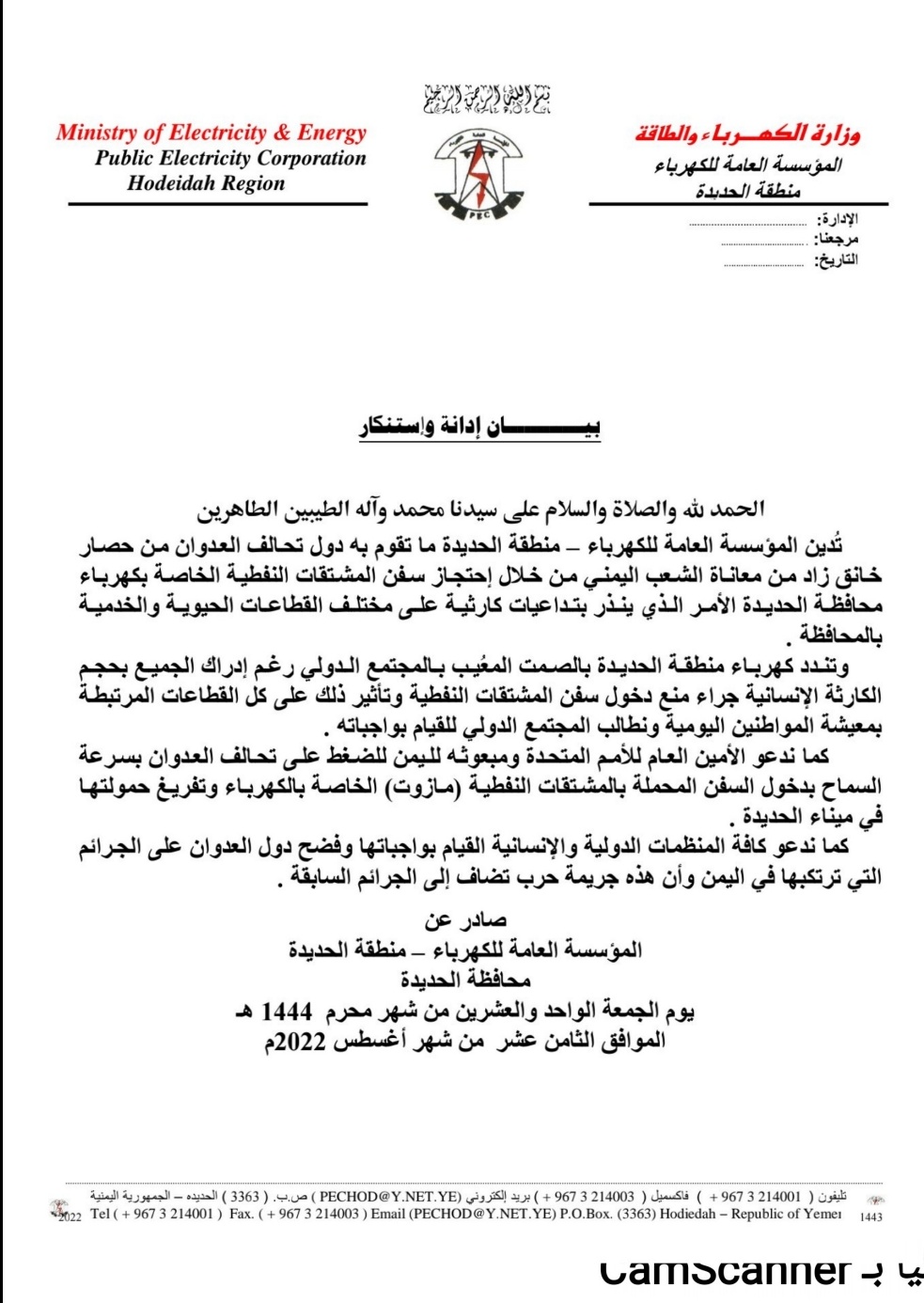 أدانت المؤسسة العامة للكهرباء منطقة الحديدة استمرار احتجاز تحالف العدوان السفن المحملة بالمازوت الخاص بقطاع الكهرباء بالمحافظة.