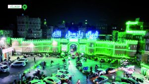 تتناثر الأنوار الخضراء لتملأ جنبات شوارع العاصمة صنعاء وحاراتها وأحيائها، بمناسبة حلول المولد النبوي الشريف، وتتزين الشوارع والطرقات باللوحات الضوئية التي تنتشر على أرصفتها وفي واجهات المحلات والمنازل وفي الجولات ليلا، فيما تشهد مهرجانات وندوات نهارا.