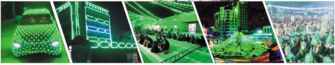 في صورة، تجسد عمق الارتباط الوثيق لليمنيين بهذا الحدث التاريخي العظيم ، الذي غير وجه الأرض .. ارتدت، العاصمة صنعاء وثلاث عشرة محافظة يمنية الأخضر، واكتست مبانيها وأحيائها وشوارعها، وكل معالمها بألوان الربيع المحمدي، احتفاء بقدوم ذكرى مولد خير البشر وسيد الخلق.
