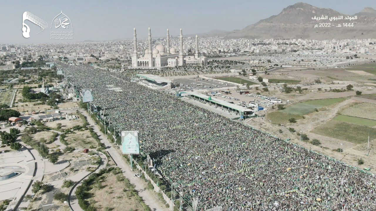 «نتواجد اليوم في ميادين رسول الله للتعبير عن محبته والاقتداء به وأيضا للتأكيد على أن الشعب اليمني بعد 8 سنوات من العدوان ما زال صامداً ومستعداً لمواجهة العدوان جيل بعد جيل وللتأكيد أيضا وقوف هذه الحشود الهادرة خلف قيادتها الثورية والسياسية في قرارها برفض الهدنة التي اعتبرها الأعداء موقف ضعف واستسلام لليمن واليمنيين وما استفاد منها سوى العدوان ومنشآته التي تصل إليها صواريخنا وطائراتنا المسيرة وأزعجت أمريكا وإمدادات النفط العالمي.. أما الشعب اليمني فلا زال يعاني تداعيات الحصار الاقتصادي واللا إنساني، ولم يعد راتبه الذي صادرته قيادة المرتزقة بعد نقل البنك المركزي إلى عدن وحرمان المواطنين من أبرز حقوقهم»