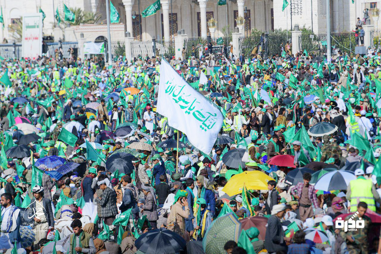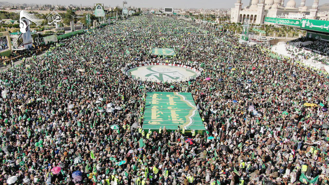 ميلاد الرسول يوم يماني إيماني عظيم تجسد في الحضور الهائل للحشود اليمانية المؤمنة المرتبطة بالرسول الأعظم سواء في الساحة المركزية بصنعاء بميدان السبعين- أمانة العاصمة أو في مختلف الساحات في عموم محافظات الجمهورية اليمنية.