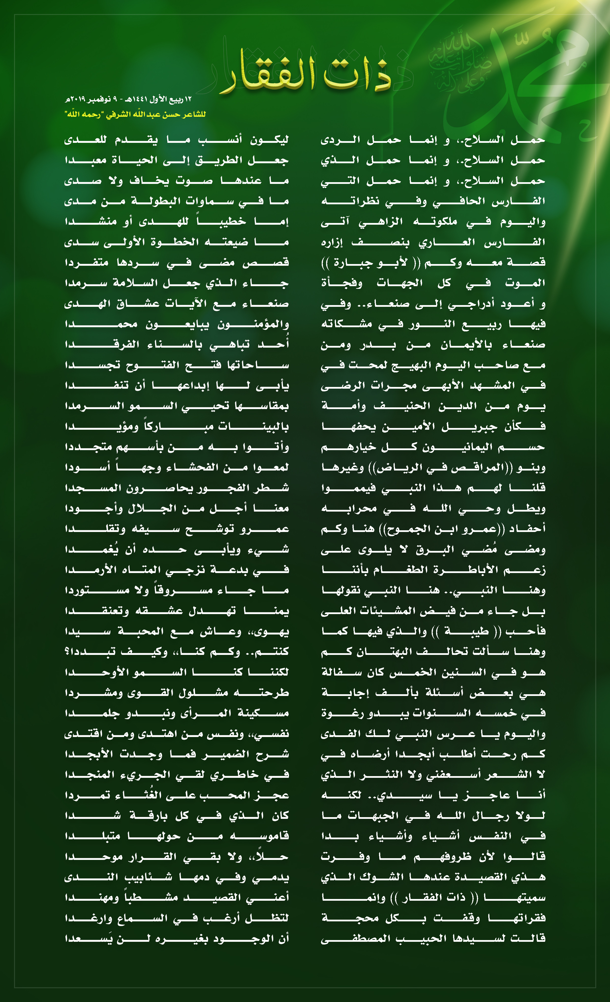 ذات الفقار للشاعر | حسن عبدالله الشرفي "رحمه الله" أدب وثقافةالمولد النبوي الشريف On أكتوبر 13, 2022 Share Share FacebookTwitterWhatsAppTelegramGoogle+البريد الإلكترونيPrint