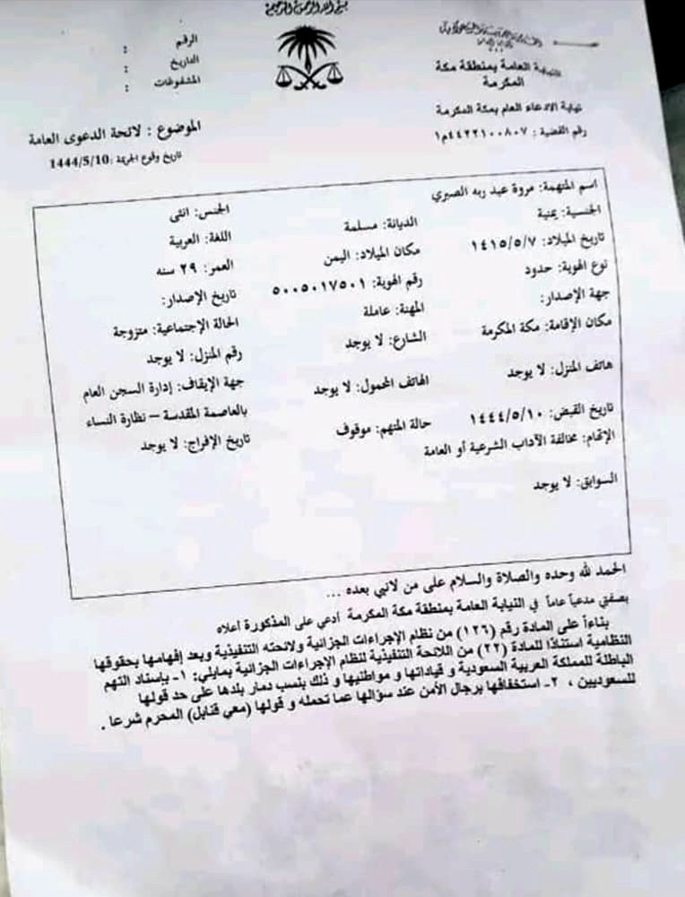 المعتمرة اليمنية مروة الصبري أرادت أداء العمرة لكنها لم تصل إلى الأراضي المقدسة وتم اقتيادها إلى سجون النظام السعودي وذنبها أنها أرادت الرد على احتقار وجهته شرطية سعودية أثناء تفتيشها وتفوهت بكلمة واحدة، وقالت في رد على السؤال الاستفزازي “نعم أنا من اليمن التي دمرتوها”، لتنهال عليها الاتهامات الملفقة التي لا يمكن تصديقها حتى من المجانين، لكن القضاء السعودي المسيّس أدانها وحكم عليها بالسجن.