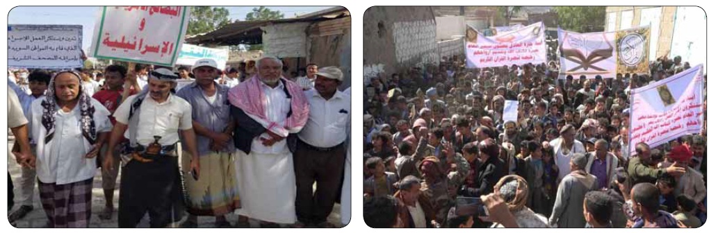 واعتبر المشاركون في الوقفات والمسيرات التي نظمت في عموم مديريات المحافظة، هذا الفعل الإجرامي، امتدادا للحرب التي يمارسها الكيان الصهيوني مستغلا ضعف الأنظمة المحسوبة على الإسلام والتي تتهافت للتطبيع معه للتآمر على الإسلام وخيانة قضايا الأمة والدين.