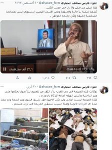 وأكد المصدر لوكالة الأنباء اليمنية (سبأ) أن أي حسابات في تويتر والفيس بوك، تحمل اسم المحافظ الحباري هي انتحال لاسمه وما يُنشر فيها من تغريدات لا تمت له بصلة.