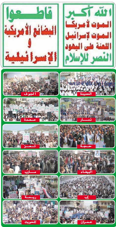 وردد أبناء عبس وحرض وحيران وميدي شعار الصرخة والمناهضة للعدوان الأمريكي الصهيوني.. ورفعوا اللافتات المطالبة بمقاطعة البضائع الامريكية.