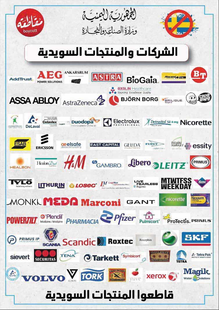 وأعلنت وزارة التجارة والصناعة في صنعاء قائمة بالمنتجات المحظورة ، وذلك تنفيذا لقرار المقاطعة الشاملة التي قررته الوزارة ردا على جريمة السويد ، وأعلنت قائمة بالبضائع التي يحظر استيرادها وإلغاء الوكالات المسجلة للسلع والمنتجات ذات المنشأ السويدي، رداً على إحراق نسخة من المصحف الشريف في العاصمة ستوكهولم.