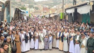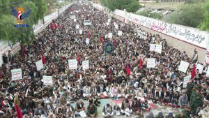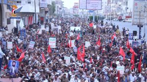 ورددت الحشود، هتافات الحرية وشعار الحسين “هيهات منا الذلة”، والتأكيد على مضي الشعب اليمني على نهج وموقف وتضحية سبط رسول الله وثورته ضد الطغاة والمستكبرين والظالمين.