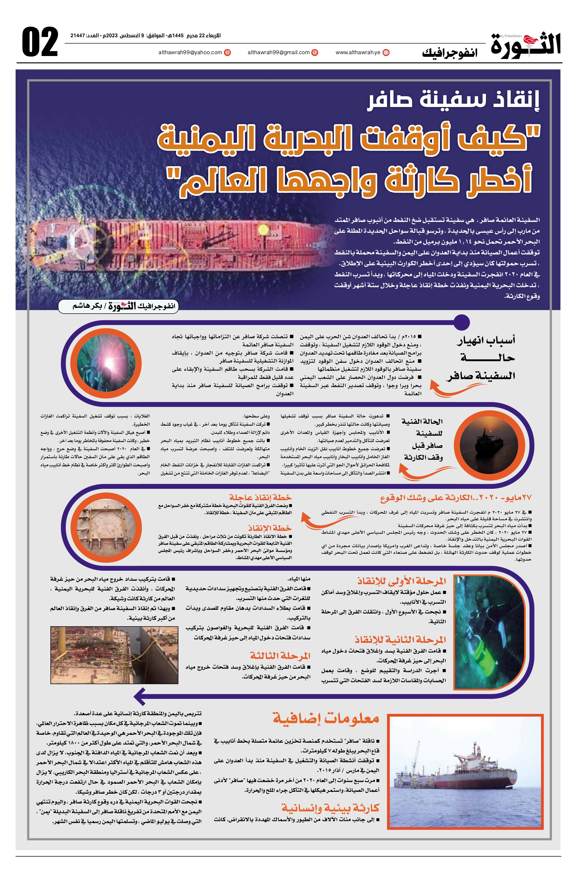 إنفوجــرافيك إنقاذ سفينة صافر ” كيف أوقفت البحرية اليمنية أخطر كارثة واجهها العالم “ إنفوجــرافيك On أغسطس 9, 2023 Share View Fullscreen Share FacebookTwitterWhatsAppTelegramGoogle+البريد الإلكترونيPrint