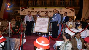 بعد ذلك سلّم سكرتير عام جمعية الكشافة القائد مطهر السواري، والمسؤول المالي للجمعية القائد محمد الحدي، وثيقة العهد والوفاء إلى وزيري الشباب والرياضة والدفاع، ليتم تسليمها إلى قائد الثورة السيد عبدالملك الحوثي.