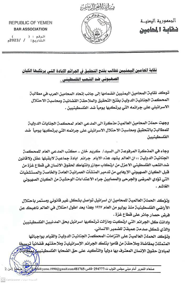 تؤكد نقابة المحامين اليمنيين انضمامها إلى جانب اتحاد المحامين العرب في مطالبة المحكمة الجنائية الدولية بفتح التحقيق والملاحقة القضائية ومحاسبة الاحتلال الإسرائيلي على جرائمه التي يرتكبها يومياً ضد الفلسطينيين.