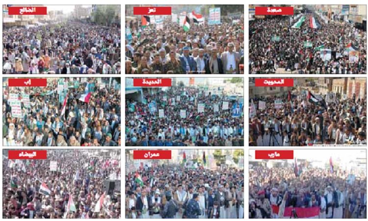 وفي الإطار شهدت عواصم المحافظات مظاهرات جماهيرية كبرى ، تحت شعار “تحالف حماية السفن الإسرائيلية لا يرهبنا”، وأكدت على ثبات الموقف اليمني في نصرة غزة ، محذرة الأعداء من أي حماقات ، ومؤكدة جهوزيتها لتنفيذ توجيهات قائد الثورة المباركة في خطابه يوم الأربعاء.