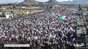 ورددت الحشود في المسيرة هتافات البراءة من أعداء الأمة “أمريكا وإسرائيل وبريطانيا” وشعار الصرخة والتنديد بمساعي أمريكا وحلفائها لعسكرة البحر الأحمر لحماية الكيان الصهيوني ودعمه للاستمرار في ارتكاب جرائم الحرب بحق الشعب الفلسطيني.
