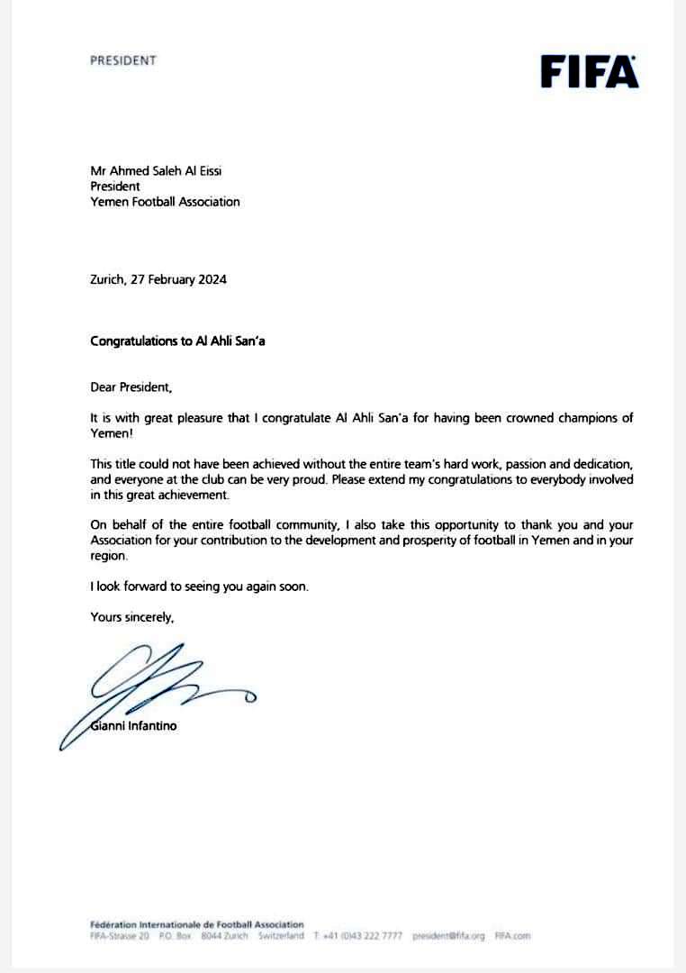 «وأرجو أن أتقدم بالتهنئة لكل من شارك في هذا الإنجاز الكبير، بالنيابة عن مجتمع كرة القدم بأكمله، أغتنم هذه الفرصة لأشكركم واتحادكم على مساهمتكم في تطوير وازدهار كرة القدم في اليمن وفي منطقتكم، وإنني أتطلع إلى رؤيتكم مرة أخرى قريبا».