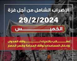 وفي هذا الصدد دعت مبادرة “شباب من أجل غزة”، إلى إضراب عربي شامل اليوم الخميس 29 فبراير الجاري.