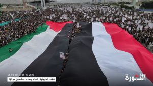 وتوسطت الجماهير بميدان السبعين لوحة كتب عليها “غـزة” تأكيدا على قوة وصلابة موقف اليمن قيادة وشعبا تجاه نصرة غزة حتى إيقاف العدوان والحصار الصهيوني وجرائم الإبادة الجماعية بحق الأطفال والنساء والشيوخ.
