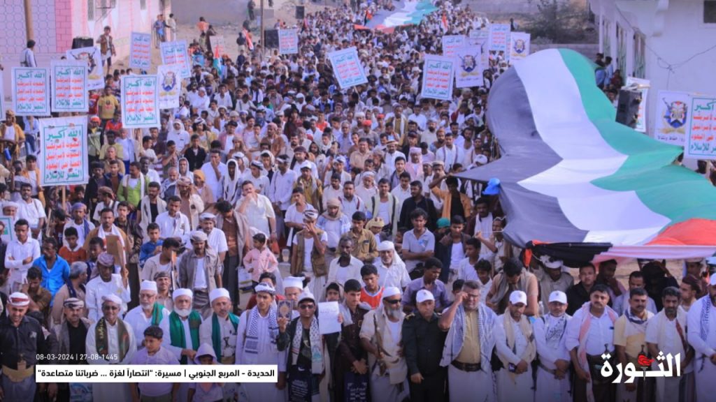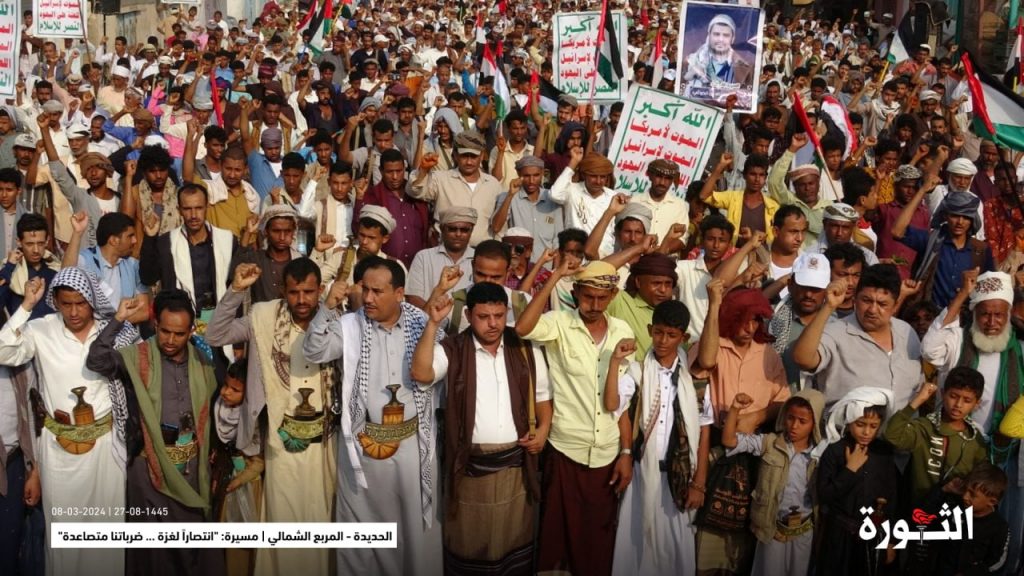 وأكدت بيانات المسيرات استمرار وقوف ابناء الشعب اليمني مع ابناء قطاع غزة الفلسطينية، الذين يتعرضون للقتل والتجويع من قبل الكيان الصهيوني بدعم أمريكي. بكل الإمكانيات المتاحة.