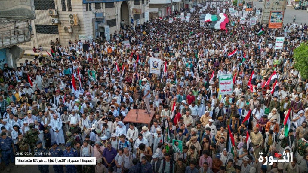 وفي المسيرة بمشاركة محافظ الحديدة محمد عياش قحيم. ووكلاء المحافظة. رفع المشاركون في ساحة شارع الميناء بمدينة الحديدة. وكافة ساحات مديريات المحافظة، العلمين اليمني والفلسطيني، والشعارات، المنددة والمستنكرة للجرائم الوحشية التي يتعرض لها أبناء قطاع غزة من قبل العدو الاسرائيلي بدعم أمريكي. وبريطانيا والماني وفرنسي. وسط صمت وخذلان الأنظمة العربية والإسلامية المطبعة.