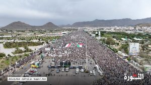 واستنكرت الحشود الجماهيرية، الصمت العربي والإسلامي وتغاضي المجتمع الدولي عما يتعرض له الأشقاء في فلسطين من مجازر وحرب إبادة جماعية بحق الأطفال والنساء بدعم أمريكي وغربي.