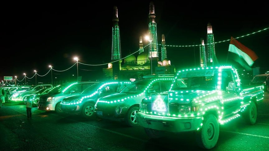 كما تشهد العاصمة صنعاء ومختلف المحافظات مسيرات ضوئية لمئات السيارات والمركبات المزينة بالأضواء الخضراء التي توّهجت بالأنوار المحمدية، لتعكس مشهداً احتفاليا مهيباً يبرز مدى الفرحة والبهجة الغامرة التي يعيشها أبناء اليمن، بقدوم ذكرى مولد نور الهدى ، وبعضها لا تقتصر داخل المدن فقط بل تقطع مسافات طويلة وهي تتنقل بين عدة مديريات ومدن وهي ترسم لوحة بديعة تعكس مدى الفرح والبهجة الكبيرة لدى اليمنيين بمختلف توجهاتهم وشرائحهم وانتماءاتهم ، كما تجسد مستوى الزخم الشعبي والرسمي في الاستعداد الكبير لاستقبال ذكرى مولد سيد البشرية ورسول الإنسانية ويعتبر اليمنيون الاحتفاء بهذه المناسبة شرفاً كبيراً ونعمة من نعم الله وتفاعلهم معها يؤكد وعيهم لأهمية هذه المناسبة ومدى ارتباطهم بالرسول الأعظم للنهوض بالأمة والسير على منهج المصطفى صلوات الله عليه وآله وسلم.